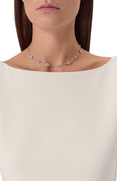 Колье Una Angelic из латуни с гальваническим покрытием родием изготовили в виде цепочки с круглыми вставками, инкрустированными кристаллами. Длина аксессуара регулируется скользящим фиксатором.