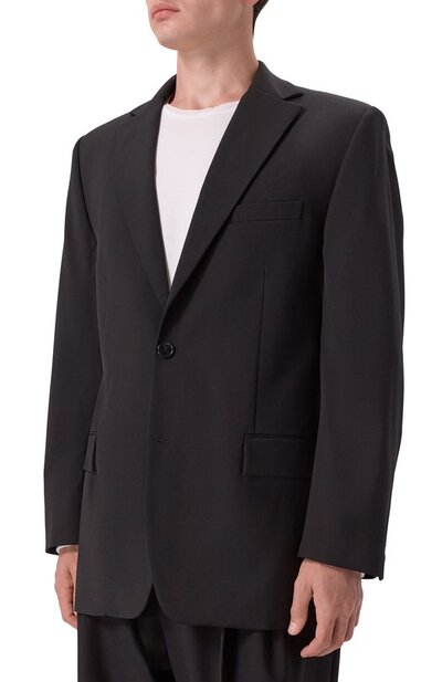 Однобортный пиджак кроя Regular fit сшили из стрейчевой ткани Cool Wool на основе полиэстера и шерсти. Сзади модель на тонком подкладе дополнили двумя шлицами. Помимо боковых карманов с клапанами предусмотрели нагрудный с листочкой.
