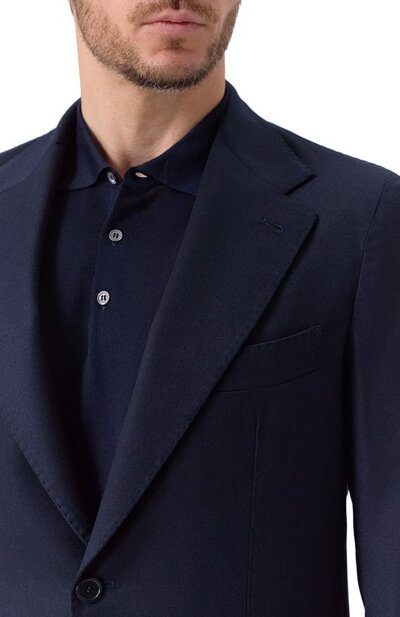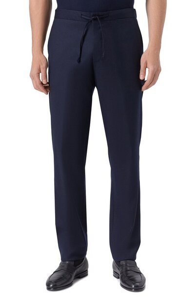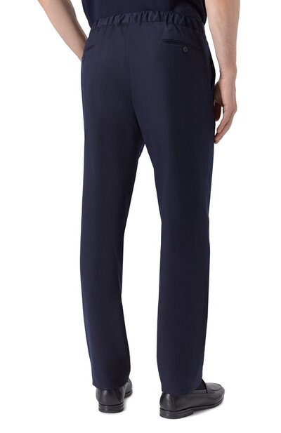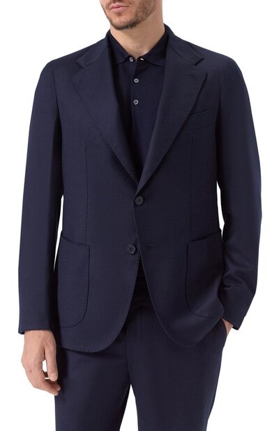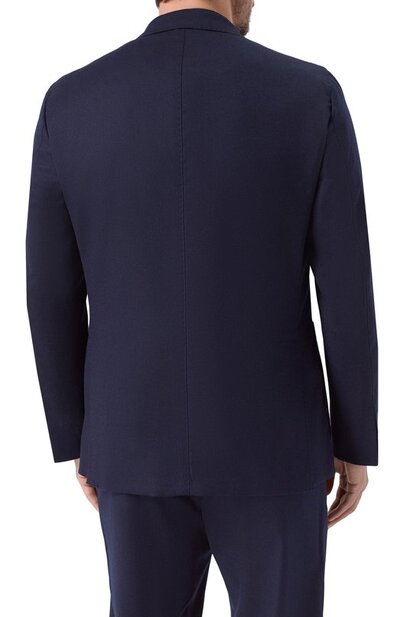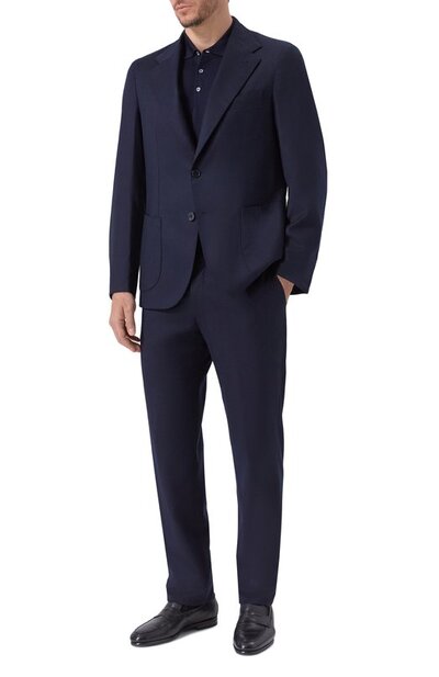 Костюм изготовили из тонкой шерсти. Однобортный пиджак с двумя шлицами дополнили тремя карманами, а прямые брюки с поясом-кулиской — двумя боковыми и парой задних с пуговицами.