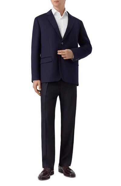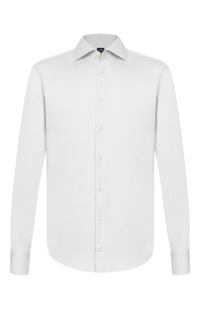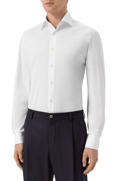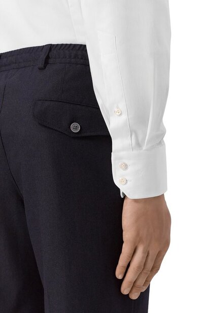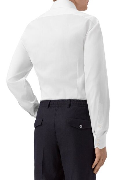 Сорочку кроя Regular fit выполнили из стрейчевого поплина на основе хлопка и полиамида. Одну из манжет со срезанным углом декорировали фирменной вышитой монограммой в тон. Модель с воротником «акула» застегивается фирменными пуговицами с тремя отверстиями.