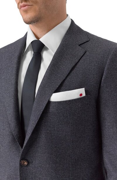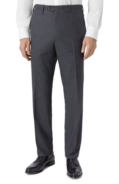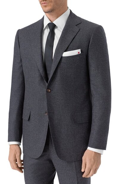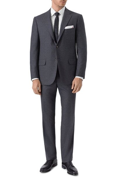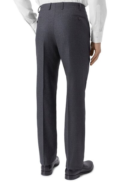 Для пошива классического костюма использовали меланжевую ткань из шерсти с добавлением кашемира. Однобортный пиджак дополнен тремя карманами, а прямые брюки со стрелками — четырьмя.