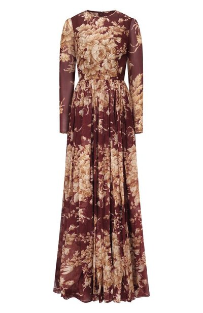 Макси-платье с цветочным принтом станет основой нарядного образа. Для пошива модели с круглым вырезом использовали шелковый шифон. Изделие застегивается потайной молнией сзади.