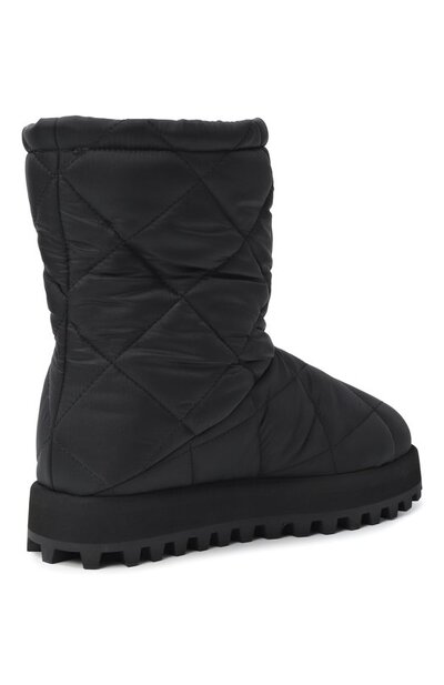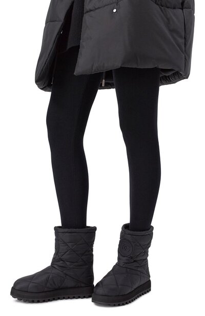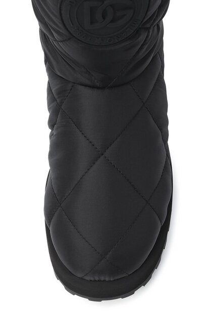 Стеганые полусапоги с брендированными круглыми нашивками спереди выполнены из текстиля. Модель без застежки установили на широкую полимерную подошву с протектором.