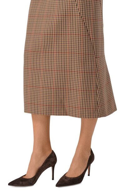 Туфли-лодочки Gianvito выполнили из замши, обтянув таким же материалом высокую шпильку. Для внутренней отделки и брендированной стельки выбрали контрастную мелкозернистую кожу.