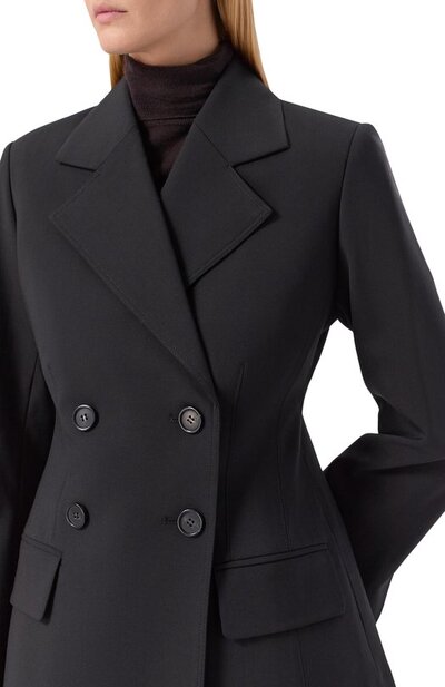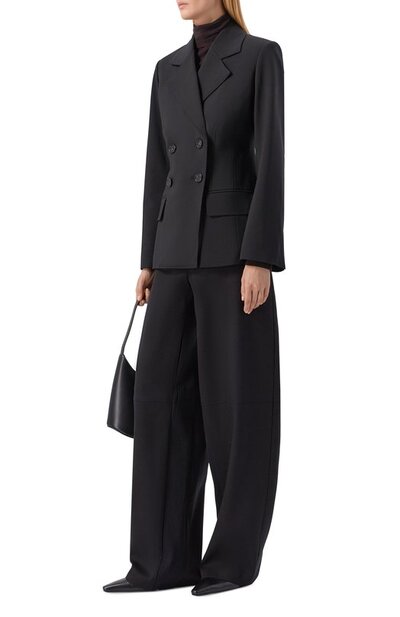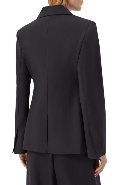 Двубортный жакет со шлицей сшили из эластичной шерсти первого пострига. Приталенную модель с широкими лацканами дополнили боковыми карманами с клапанами.