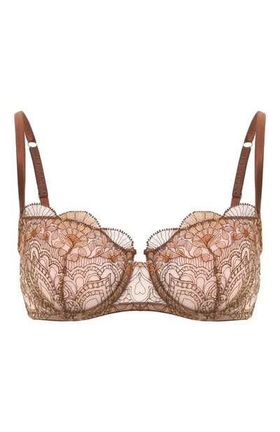 Бюстгальтер-балконет с мягкими чашечками на косточках выполнен из полупрозрачного тюля с узорами, напоминающими витражи из венецианского стекла. Модель с регулируемыми атласными бретелями отделана фестончатым кружевом.
