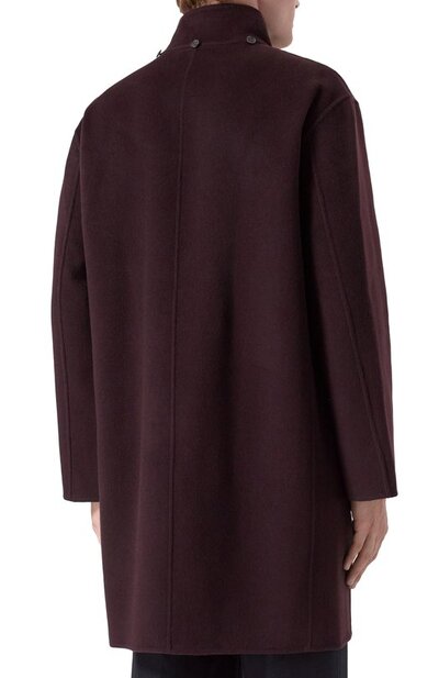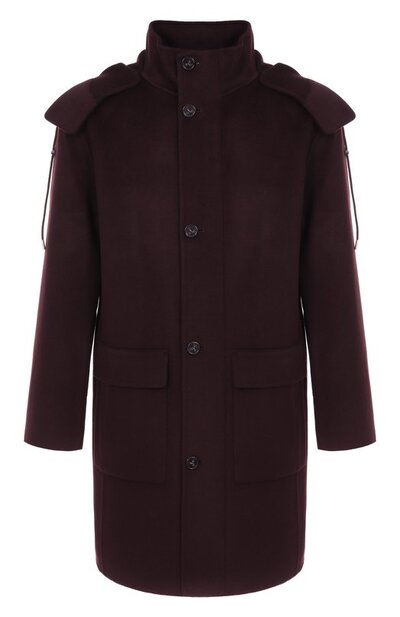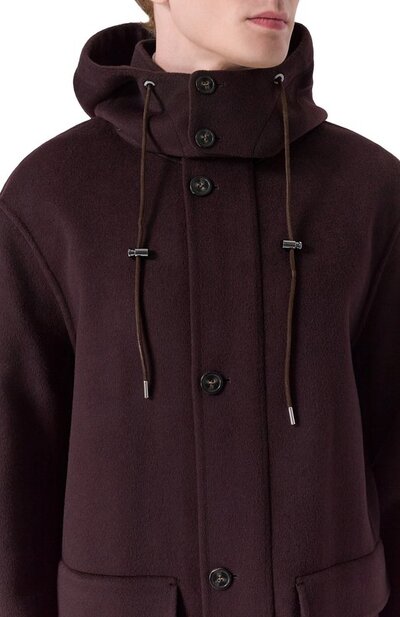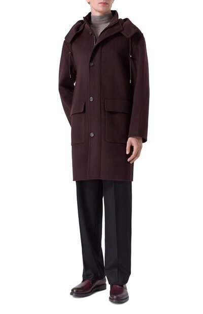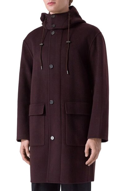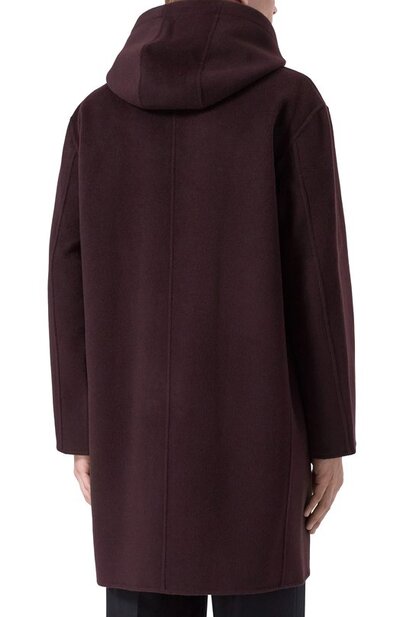 Однобортное пальто выполнили без подклада в технике double face из двух слоев ткани на основе мериносовой шерсти с добавлением кашемира. Модель с отстегивающимся регулируемым капюшоном дополнили парой накладных карманов с клапанами.