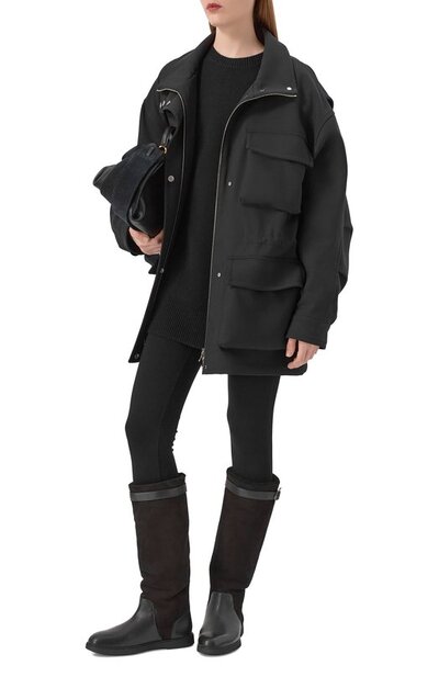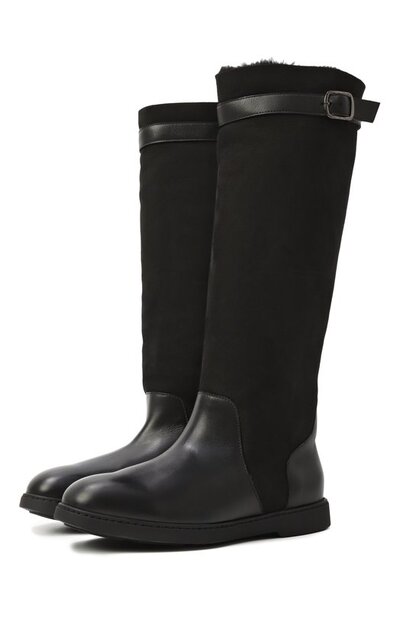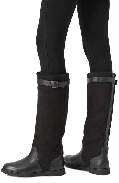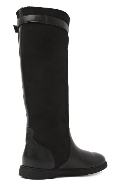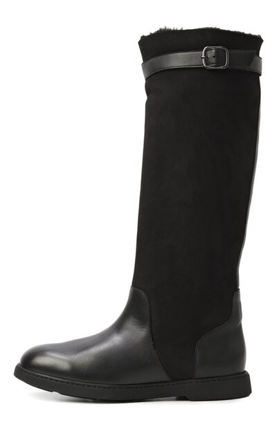 Сапоги с внутренней отделкой из пушистой овчины выполнили из гладкой кожи и замши. Широкое голенище модели на плоской протекторной подошве дополнили ремешком с пряжкой.