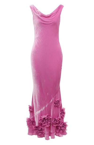 Розовое приталенное миди-платье с мягкими драпировками вдоль круглых вырезов сшито из вискозного струящегося бархата с добавлением шелковых волокон. Салони Лодха украсила подол однотонной модели широкой волнистой оборкой и крупными цветочными аппликациями. Образ помогут завершить черные балетки и сумка.