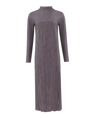Это платье — пример утонченной эстетики, сочетающей современный минимализм и выразительную текстуру. Его приглушенный серо-лиловый оттенок придает образу спокойную элегантность, идеально вписываясь в концепцию сдержанного шика. Изюминкой дизайна является эффектная жатая текстура, которая добавляет живость и визуальный интерес, подчеркивая инновационный подход к выбору ткани и игривое взаимодействие со светом и тенью. Прямой крой и скромная длина миди создают изысканную и стройную линию, позволяя в полной мере оценить эстетику фактуры материала. Высокий воротник поддерживает чистоту и лаконичность образа, добавляя нотку аристократичности. Длинные рукава придают образу завершенность, обеспечивая баланс между открытостью и сдержанностью. Этот фасон легко адаптируется к разным стилевым решениям, позволяя аксессуарам задавать тон общему впечатлению. Платье идеально подойдет для любителей стиля "арт-деко" и станет прекрасной основой как для повседневных, так и для более торжественных ансамблей, внося в каждое появление аккорд изыска и индивидуального стиля.