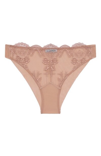 Для изготовления трусов из коллекции Espresso Evening использовали тонкий стрейчевый материал и полупрозрачный тюль с вышивкой. Модель с фигурным краем спереди дополнили хлопковой ластовицей.
