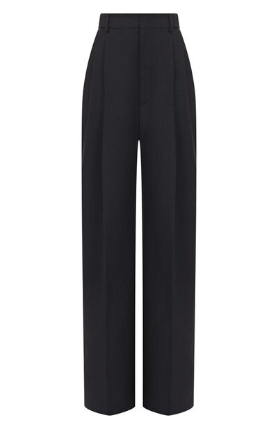 Широкие брюки с высокой посадкой и тремя карманами сшили из шерсти. Модель с защипами и стрелками дополнили поясом со шлевками, задние из которых выполнили в виде литеры М.