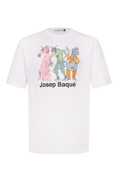 Футболку со слегка спущенной линией плеч выполнили из хлопкового джерси. Спереди модель украсили принтом с иллюстрациями испанского художника Josep Baque.