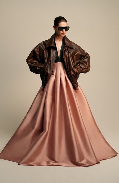 Макси-платье Mikado с шелковым подкладом сшили из атласа. Пышный подол со складками дополнили шлейфом. Модель с открытой спиной и глубоким V-образным вырезом застегивается потайной молнией сзади.