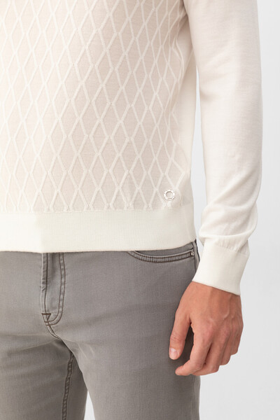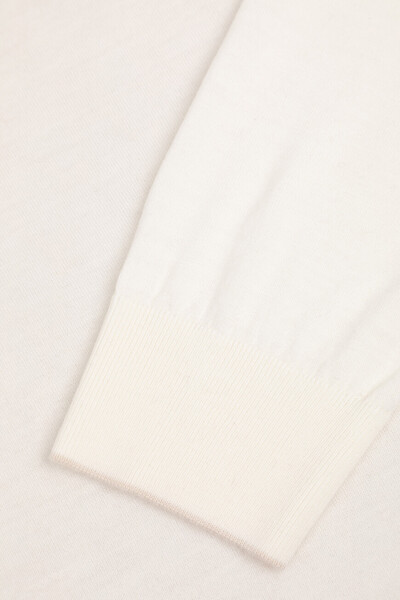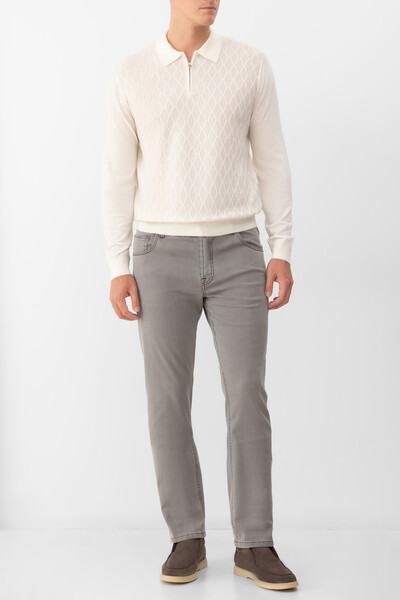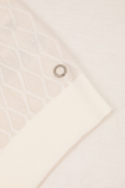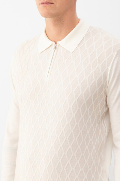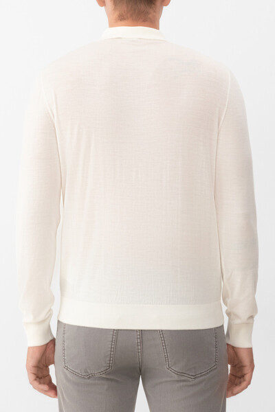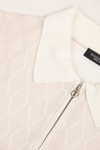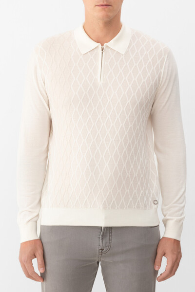 Поло Stefano Ricci с аккуратным воротником с молнией. Для производства функциональной модели с длинными рукавами используется пряжа на основе мягкой вирджинской шерсти, гладкого шёлка и кашемира. Дизайн изделия белого цвета завершают рельефный геометрический узор в виде ромбов и металлическая деталь-восьмигранник спереди.