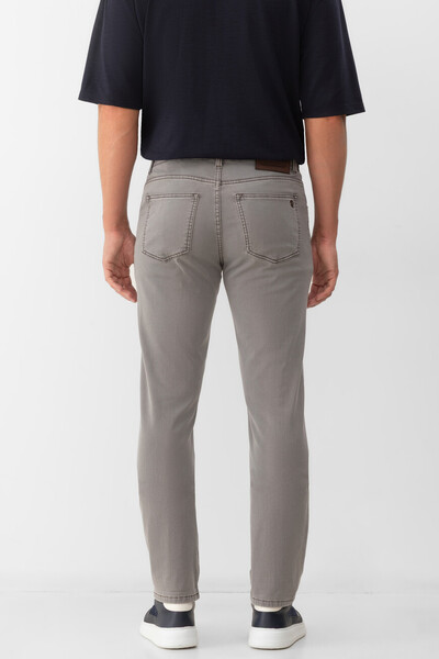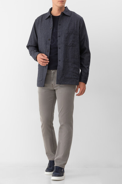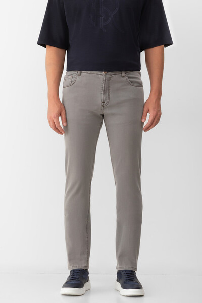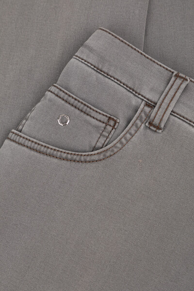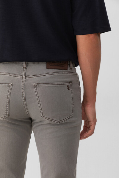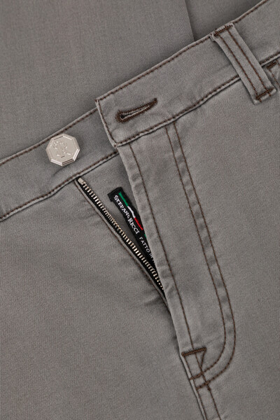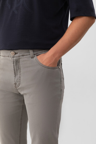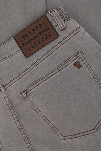 Пятикарманные джинсы Stefano Ricci с выьеленным эффектом. Для создания модели с эластичными боковыми вставками для удобства надевания выбран эластичный хлопковый деним серого цвета с добавлением синтетических волокон. Атрибутами Дома являются прямоугольный патч с тиснёным логотипом на поясе сзади, серебристая деталь-восьмигранник спереди и вышитая монограмма, расположенная на правом заднем кармане.