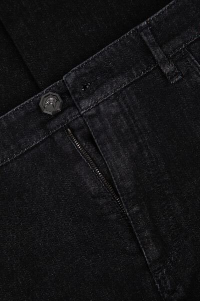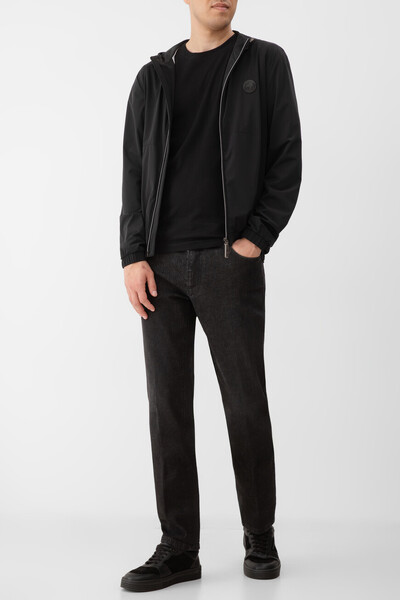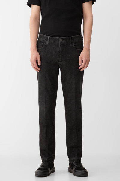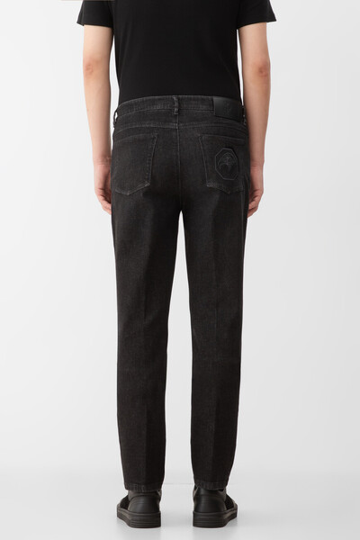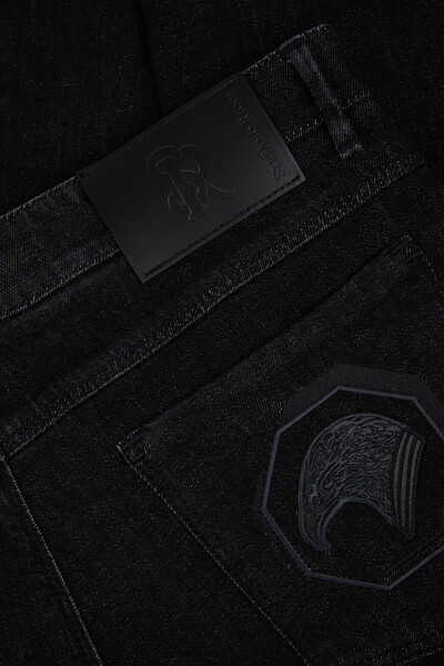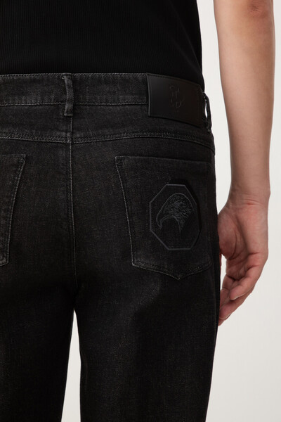 Джинсы Stefano Ricci из мягкого денима с добавлением стрейчевых волокон. Изделие выполнено на основе хлопка и кашемира чёрного базового цвета. Модель свободного кроя сверху и зауженного от колена до щиколотки застёгивается на молнию, покрытую планкой, и брендированную металлическую пуговицу. Отличительными деталями являются кожаный патч с тиснёными надписью-лого и монограммой на поясе сзади и крупная символика с изображением головы орла в восьмиграннике, вышитая на правом заднем кармане.