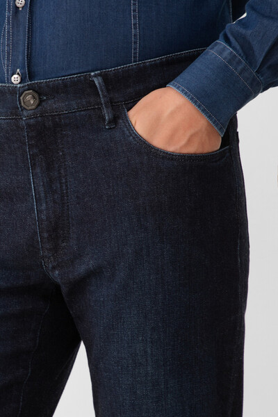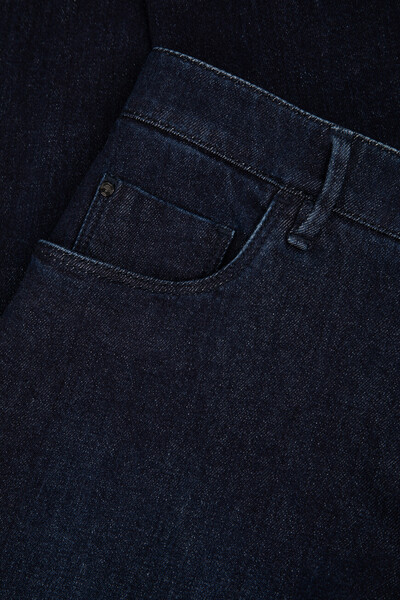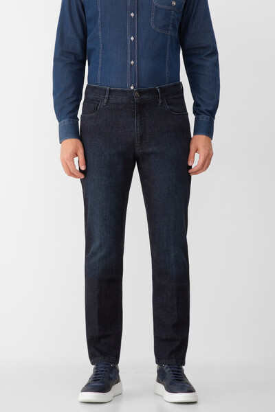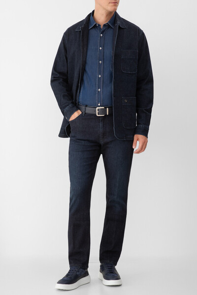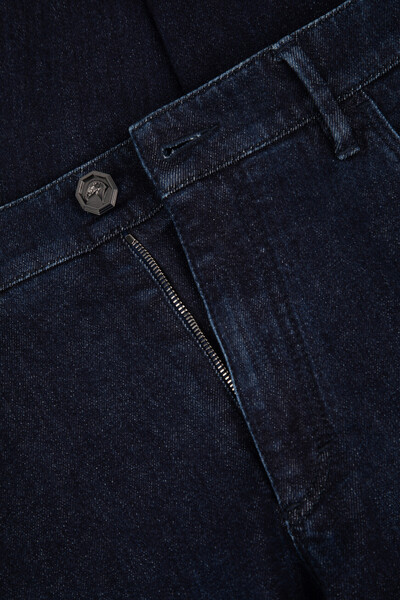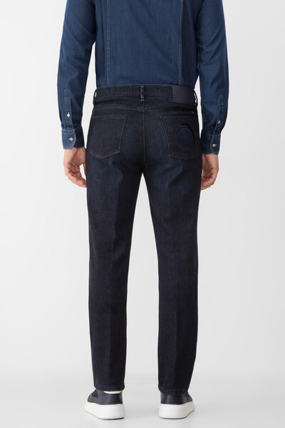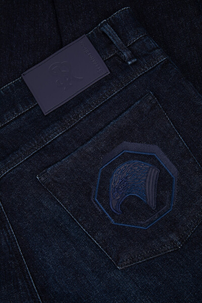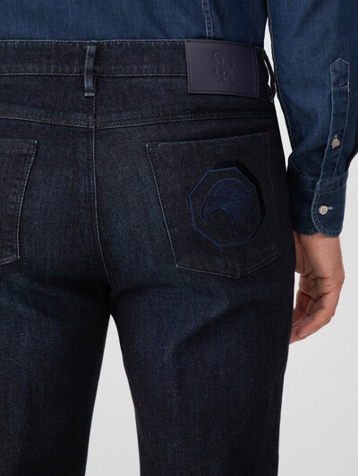 Тёмно-синие джинсы Stefano Ricci с дизайнерскими потёртостями. Для пошива изделия прямого силуэта выбран мягкий эластичный деним на основе хлопка и кашемира. Фасон повседневной модели характеризуется наличием пяти традиционных карманов и застёжки на молнию, покрытую планкой, и брендированную металлическую пуговицу. В роли атрибутов Дома выступают кожаный патч с тиснёными надписью-лого и монограммой на поясе сзади и крупная символика с изображением головы орла в восьмиграннике, размещённая на правом заднем кармане.