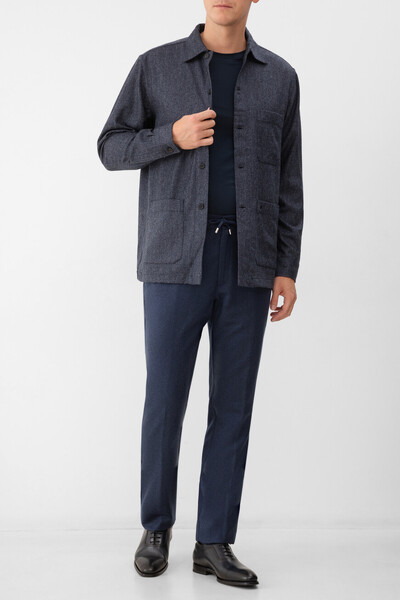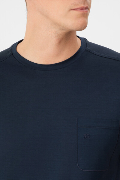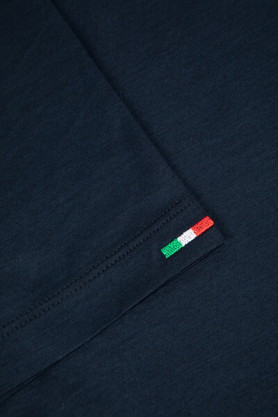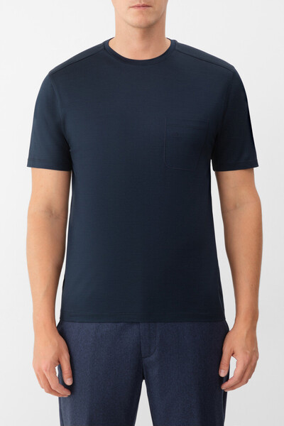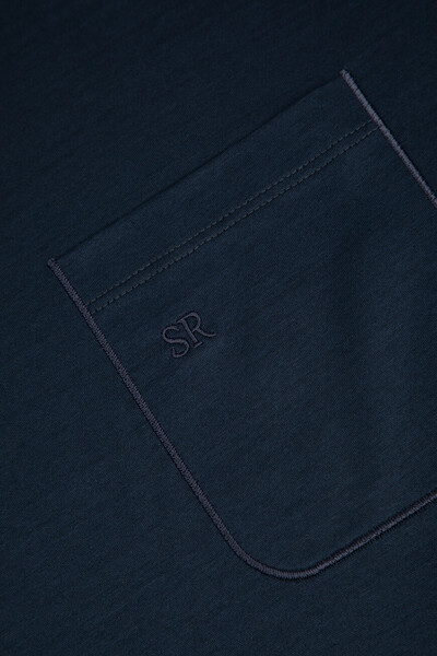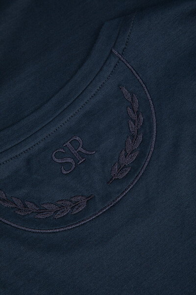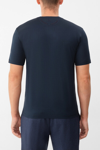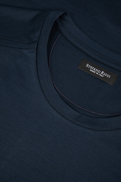 Футболка Stefano Ricci с культовой тональной вышивкой. Модель изготовлена из мягкого хлопкового трикотажа тёмного-синего цвета с традиционными короткими рукавами. Характерными особенностями изделия являются прямой силуэт и наличие нагрудного накладного кармана с окантовкой слева. На принадлежность футболки Дому указывают вышитые лого-монограммы на кармане и спинке под воротником.
