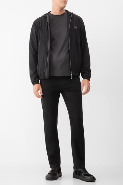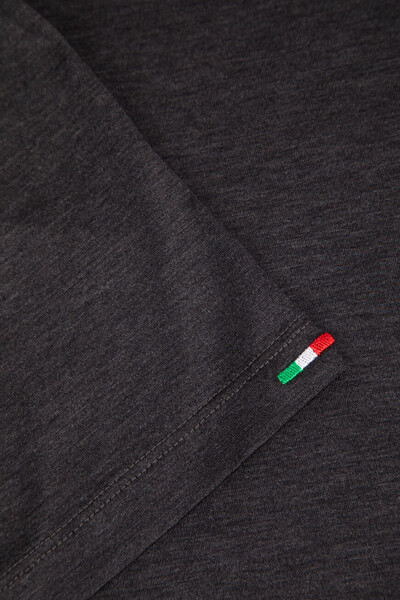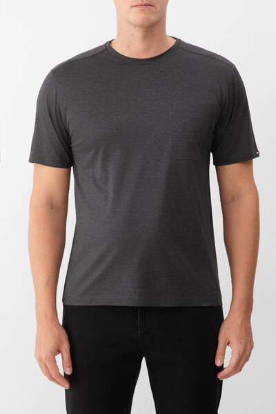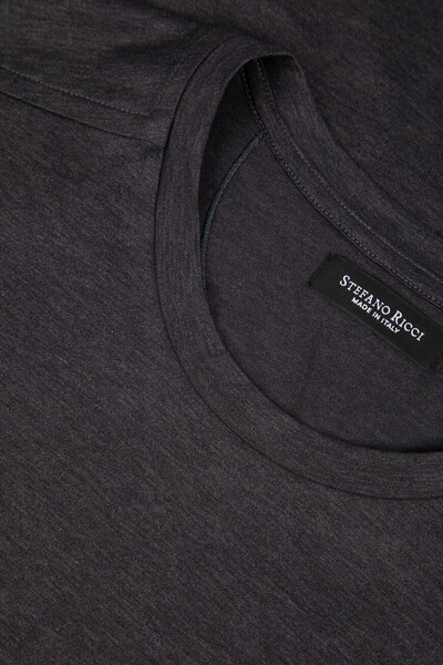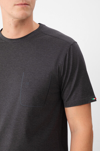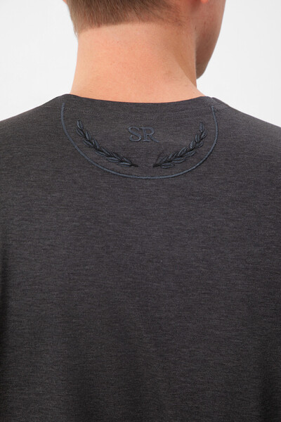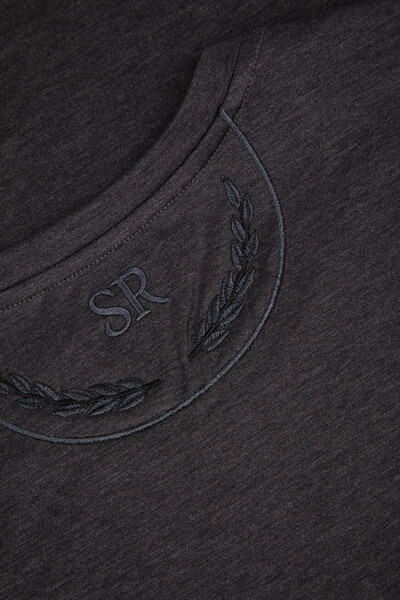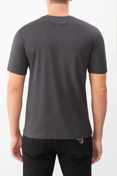 Футболка из мягкого хлопкового трикотажа тёмно-серого цвета от Stefano Ricci. В роли знакового для бренда декора выступают вышитые лого-монограммы в тон на нагрудном накладном кармане слева и спинке под воротником. Карман и кокетка обрамлены окантовкой, а спинка также подчёркнута вышитым лавровым венком.