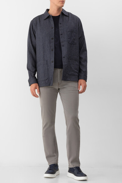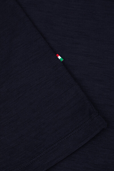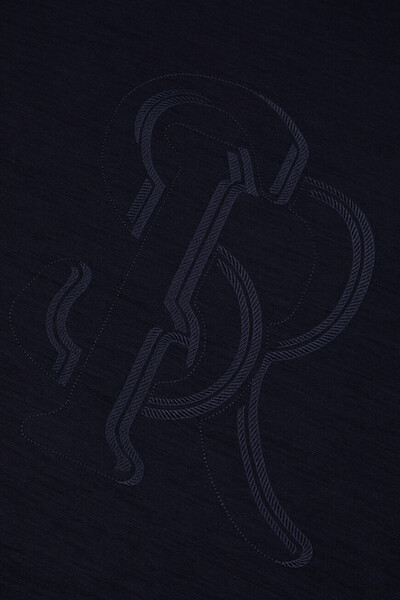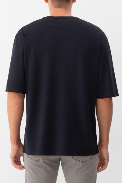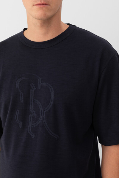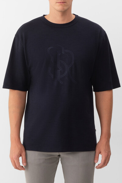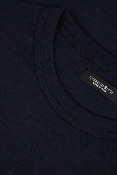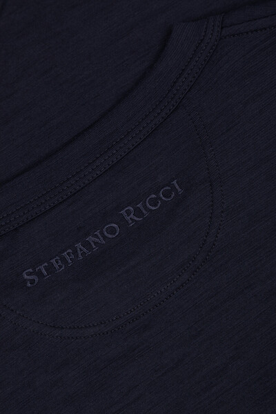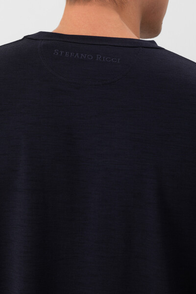 Трикотажная футболка Stefano Ricci с короткими рукавами. Для создания изделия тёмно-синего цвета используются шерсть и прочный нейлон. Декором выступают вышитые крупная монограмма SR спереди в тон и поддерживающая её надпись-логотип бренда на кокетке.