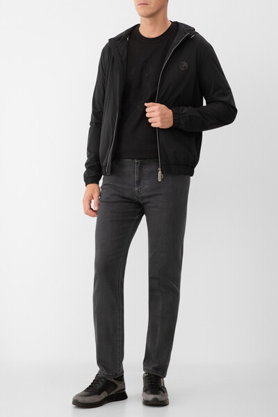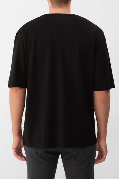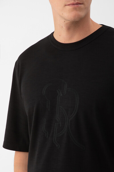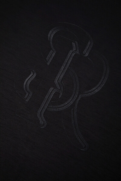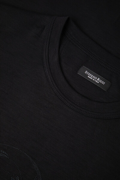 Чёрная футболка Stefano Ricci сыграет роль основы для создания повседневных комплектов. Для пошива изделия с круглым вырезом горловины на резинке выбрано мягкое джерси на основе шерсти с добавлением прочных нейлоновых волокон. О принадлежности модели Дому напоминают вышитые крупная монограмма SR спереди в тон и надпись-логотип на кокетке.