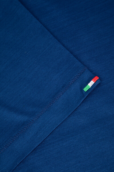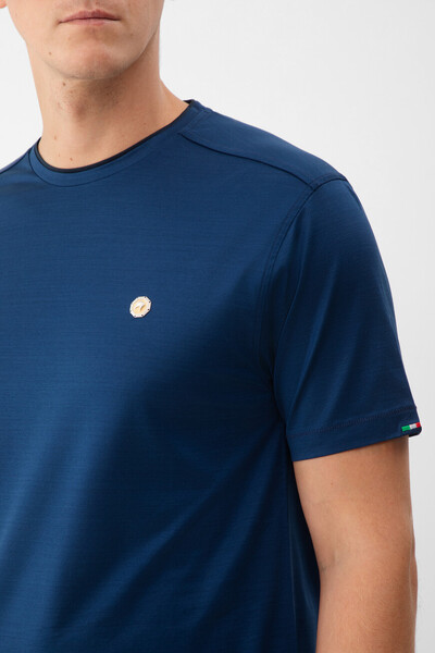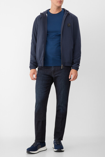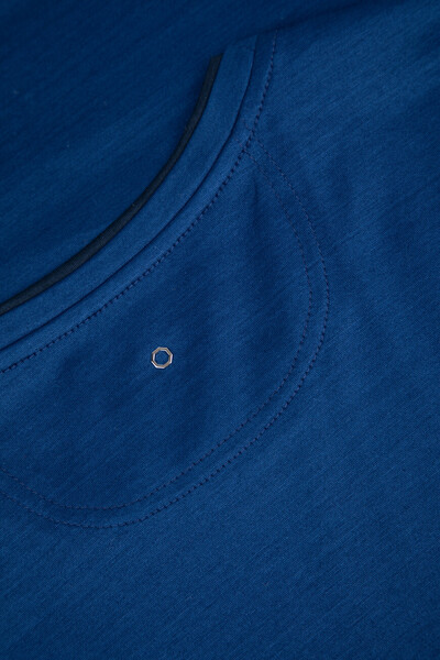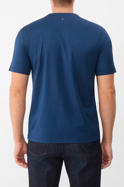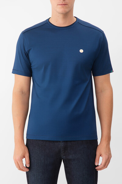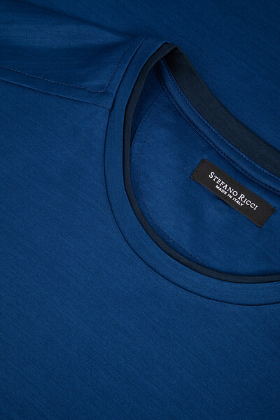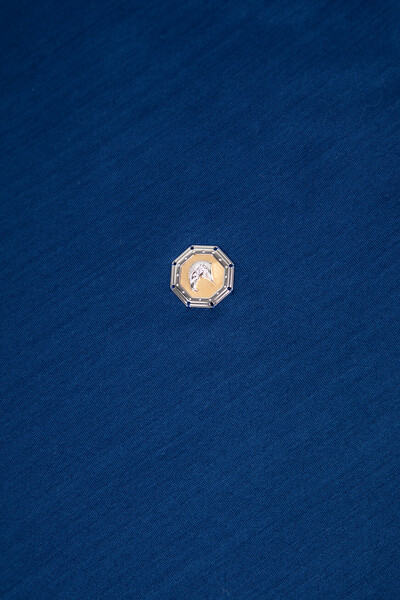 Прямая футболка Stefano Ricci с культовой символикой Дома. Изделие выполнено из мягкого хлопкового джерси насыщенного синего цвета. Отличительными деталями стали металлическая эмблема Royal Eagle слева на груди, миниатюрный восьмигранник серебристого оттенка на спинке под воротником и тёмно-синяя вставка-полоса на круглом вырезе горловины, создающая иллюзию многослойности.