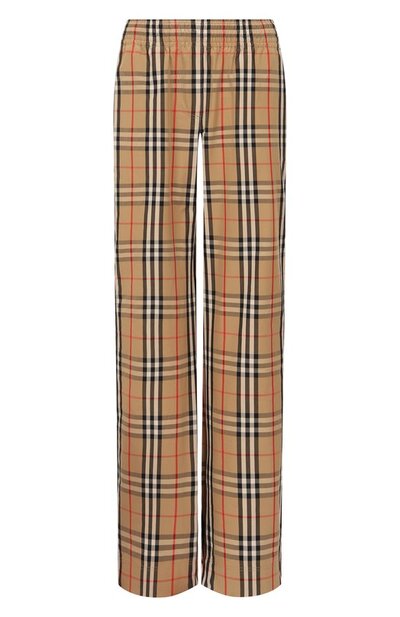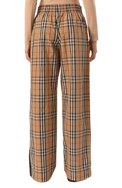 Брюки с эластичным поясом выполнили из хлопка в клетку Burberry Check. По бокам предусмотрели пару карманов и контрастные однотонные лампасы.