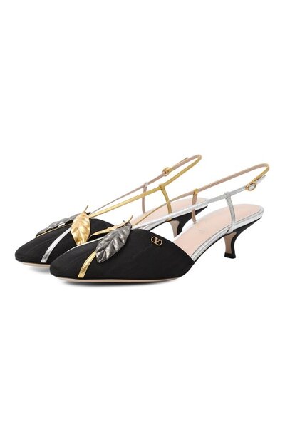 Союзку слингбэков Foliefoliage из твила подчеркнули эмблемой VLogo Signature и аппликацией в виде листьев. С декором перекликается двухцветный ремешок из металлизированной кожи, застегивающийся миниатюрной овальной пряжкой. Туфли с серебристым узором на стельке установили на каблук kitten heel.