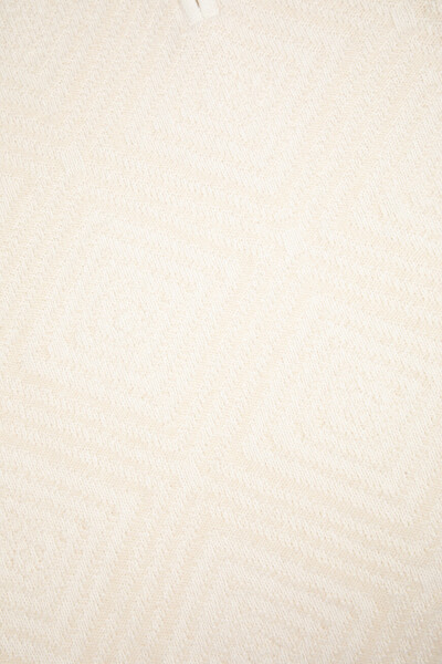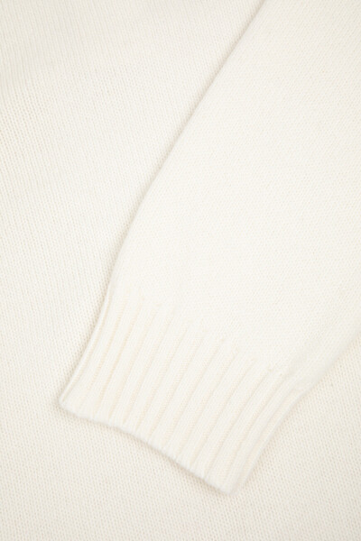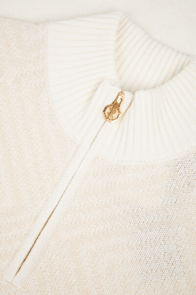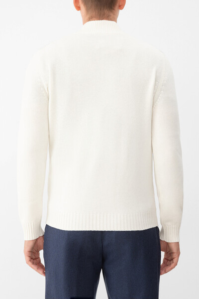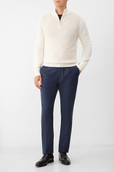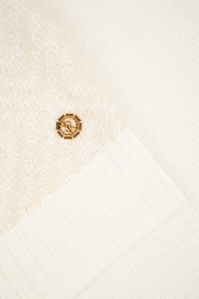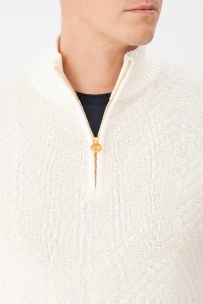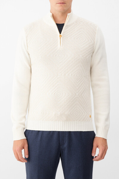 Свитер Stefano Ricci с высоким воротником-стойкой. Для создания модели на молнии золотистым брендированным пуллером сверху используется трикотаж на основе мягкой шерсти и кашемира. Лицевая стенка декорирована вставкой с фактурным геометрическим узором в виде ромбов на белом фоне. На принадлежность изделия Дому указывает деталь-восьмигранник со вписанной в неё лого-монограммой.