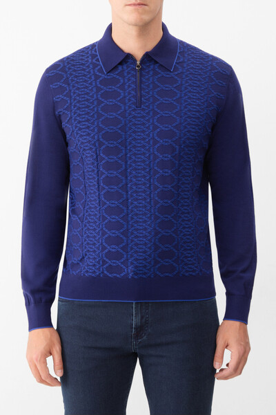 Трикотажное поло Stefano Ricci выполнено в синей гамме. Для производства повседневной модели выбраны мягкая шерсть и гладкий шёлк. Изделие украшает графичный жаккардовый мотив на лицевой стенке. Принадлежность изделия прямого силуэта Дому деликатно обозначена металлическим пуллером молнии.