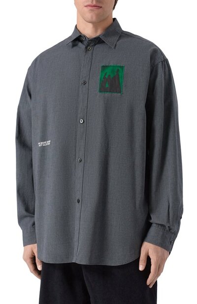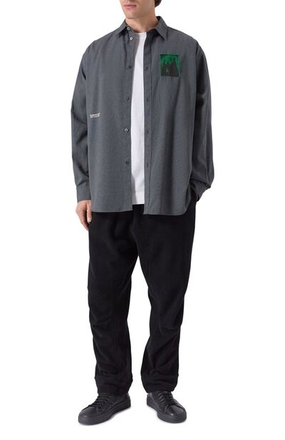 Рубашку с фигурным низом, защипами сзади и регулируемыми манжетами дополнили боковыми карманами. Oversize-модель из хлопка oxford украсили спереди вышитой контрастной надписью и патчем с графичным мотивом.