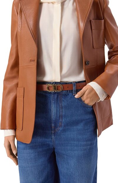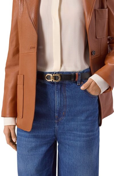 Ремень с парой тренчиков застегивается кобурной пряжкой Gancini с прямоугольной вставкой в центре. Аксессуар из тисненой телячьей кожи, окрашенной контрастными оттенками, можно носить любой стороной наружу.