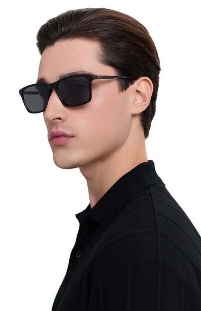 Солнцезащитные очки с выгравированным логотипом на металлических дужках выполнили из глянцевого ацетата. Поляризованные линзы из поликарбоната блокируют 100% ультрафиолета.