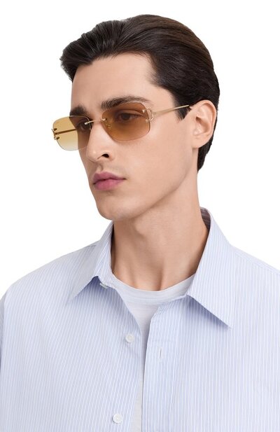 Безободковые солнцезащитные очки из линии Decor C de Cartier выполнили из металла. Крепления дужек с брендированными вставками на заушниках изготовили в форме литеры C.