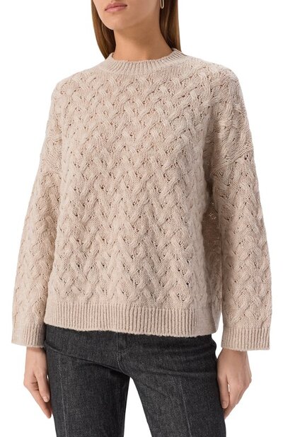 Свитер с сильно спущенной линией плеч выполнили неплотной фактурной вязкой, а круглый вырез, манжеты и пояс – резинкой. Для создания модели использовали микс шерсти и кашемира с добавлением металлизированных нитей и микропайеток.