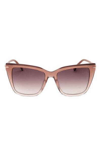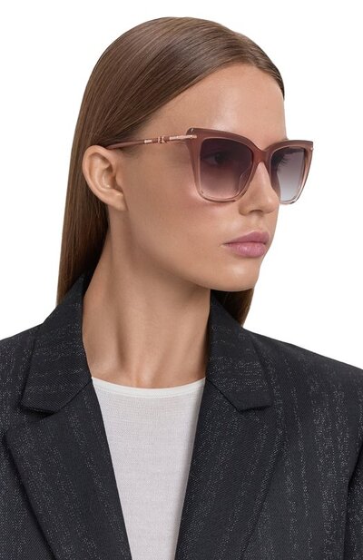 Солнцезащитные очки формы cat eye выполнили из полупрозрачного ацетата. Тонкие дужки аксессуара с градиентными линзами украсили шармом-эмблемой.