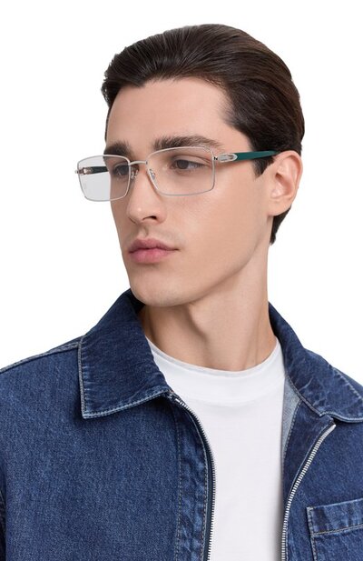 Для изготовления тонкой оправы очков из коллекции C Decor использовали металл с платиновым покрытием. Аксессуар с подвижными прозрачными носоупорами дополнили ацетатными заушниками на дужках с шарнирами в виде литеры C.