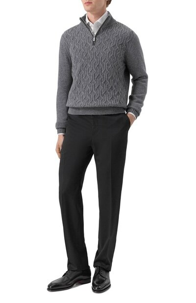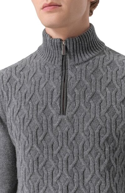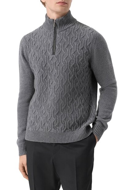 Свитер с рельефным арановым узором спереди выполнили из шерстяной пряжи с добавлением кашемира. Модель с отделкой в рубчик дополнили короткой молнией, усиленной замшевым кантом, на высокой горловине.