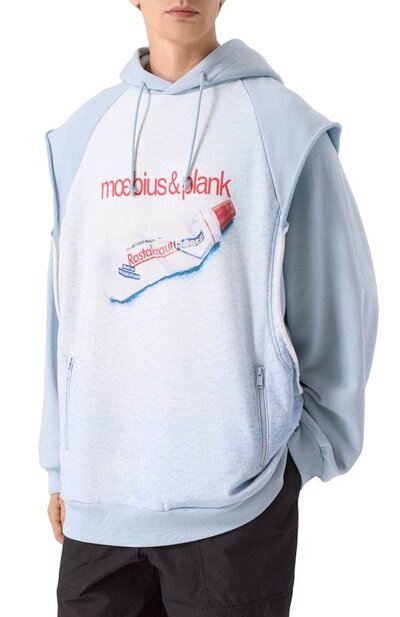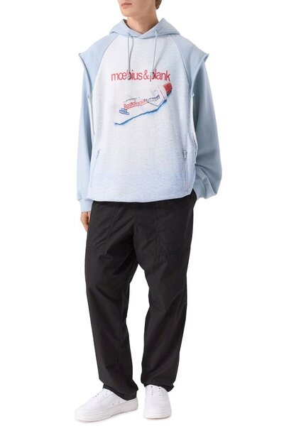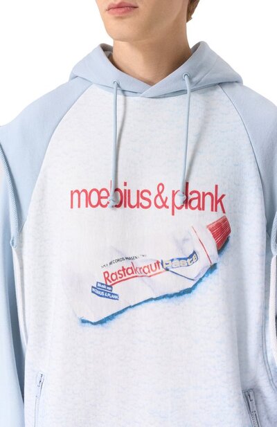 Худи силуэта oversize сшили из хлопкового трикотажа. Модель с регулируемым капюшоном и двумя врезными карманами на молниях украсили принтом в виде обложки музыкального альбома дуэта Moebius & Plank.