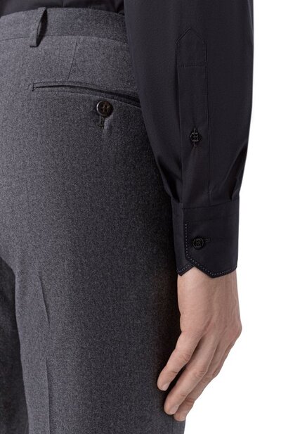 Сорочку с фирменными тройными строчками по краям отложного воротника и скошенных манжет выполнили из хлопкового поплина. Модель застегивается перламутровыми брендированными пуговицами в тон.