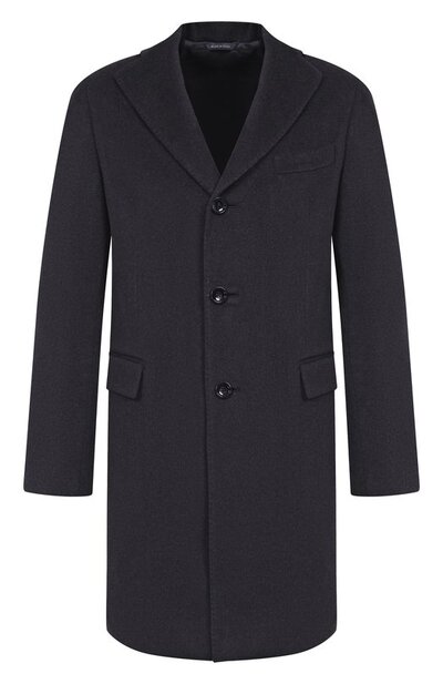 Однобортное пальто на атласном подкладе выполнили из кашемира. Модель с прямоугольными лацканами и шлицей сзади дополнили нагрудным карманом и боковыми с клапанами.
