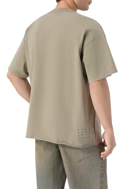 Футболку Blasted Ekcess с необработанным краем сзади и боковыми швами наружу выполнили из хлопкового трикотажа. Модель с вышивкой T-Box и принтом Sign of the Times украсили искусственными разрывами.