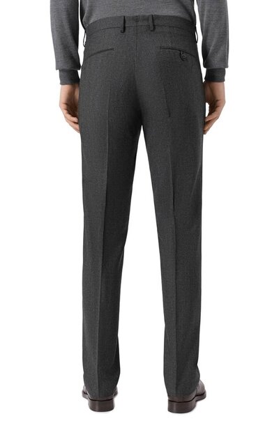 Для пошива брюк со стрелками использовали эластичную шерсть с микроузором. Модель с классической посадкой дополнили пятью врезными карманами.