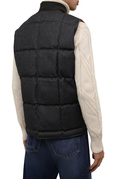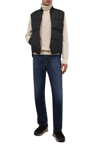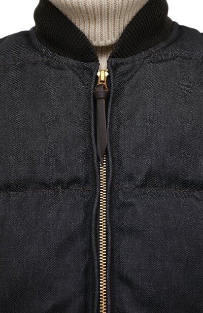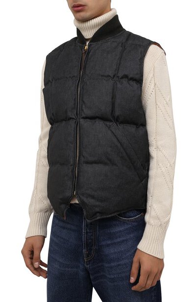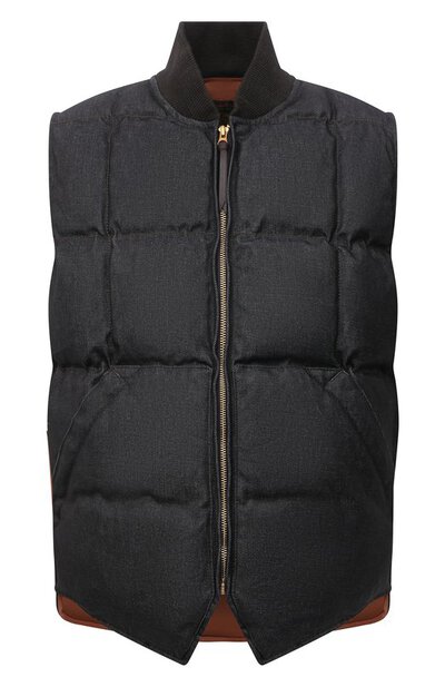 Темно-синий жилет из осенне-зимней коллекции сыграет роль верхней одежды, если надеть его поверх свитера и джинсов, или выручит как утепляющий слой под тонкое пальто. Ральф Лорен выбрал для пошива модели с фигурным низом и трикотажным воротником-стойкой, как у бомбера, прочный плотный хлопковый твил. Слой синтепона не утяжеляет изделие, но поддерживает оптимальную температуру.