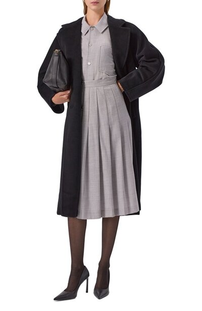 Двубортное пальто Madame с роговыми пуговицами выполнили из бобровой ткани на основе шерсти первого пострига с добавлением кашемира. Модель на брендированном подкладе из купро дополнили двумя карманами с листочками по бокам. В комплекте — широкий пояс.
