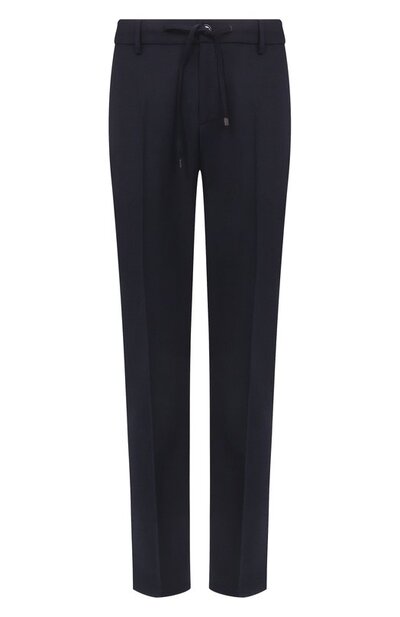 Слегка зауженные брюки Spiaggia со стрелками дополнили поясом-кулиской c эластичными вставками. Для пошива модели с тремя карманами, отделанными кантом из алькантары, использовали чистую шерсть.