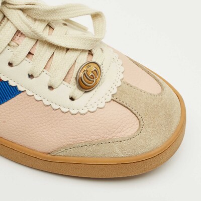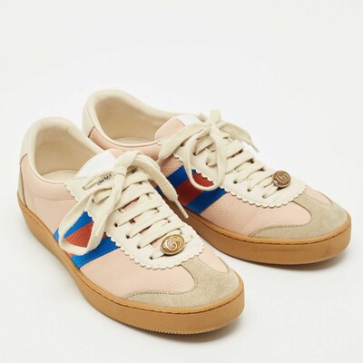 A bold play on textures and tones, these Gucci sneakers bring together multicolor leather and suede with the iconic web detail. Designed with a lace up front and set on a comfortable sole, they are equal parts sporty and stylish, perfect for elevating everyday looks.