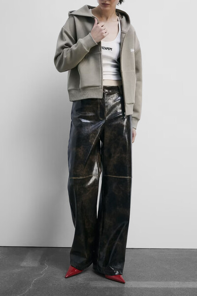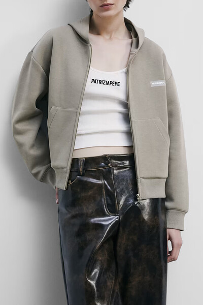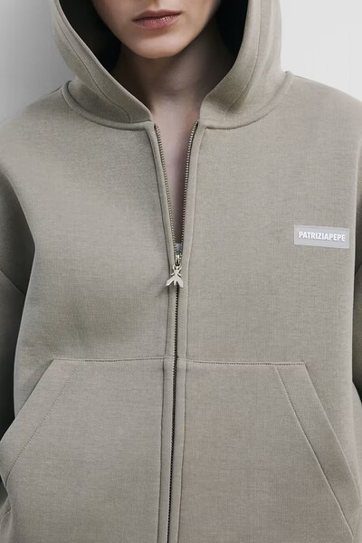 Толстовка Patrizia Pepe с глубоким капюшоном. Для производства изделия с приспущенной линией плеча выбран мягкий трикотаж на основе хлопка и прочного полиэстера. Модель из высокотехнологичной ткани бежевого оттенка - это идеальный пример уличной моды, с застёжкой-молнией во всю длину и открытыми накладными карманами. Толстовка стандартного силуэта идеально завершит образы в стиле urban glam.