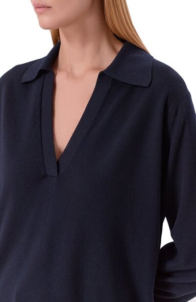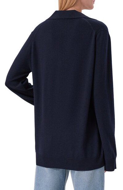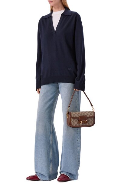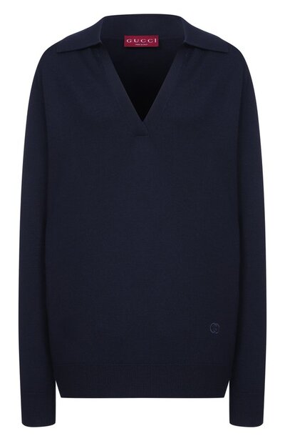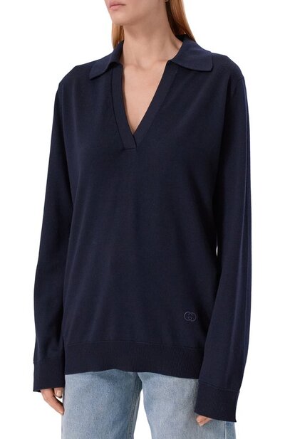 Oversize-поло с глубоким V-образным вырезом выполнили из шерсти Extrafine. Снизу модель украсили вышитой эмблемой Interlocking G в тон.